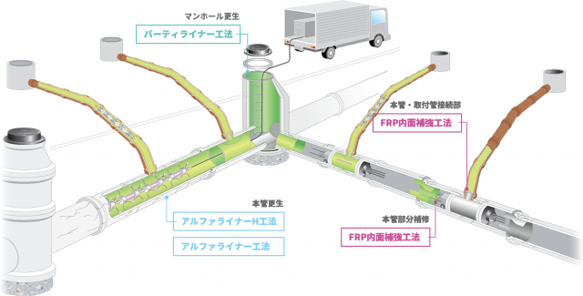 下水道管路のあらゆる不良箇所を安全、安心、確実に修繕・改築をし、損傷した管渠の延命化、長寿命化に貢献する内面補強工法です。