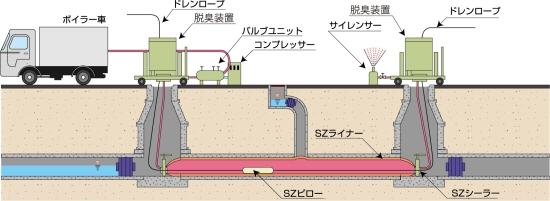パルテムSZ工法は既設マンホールを利用して管渠内にSZライナーを引き込み、空気と蒸気で拡張・加熱して管渠の中に自立管のSZパイプをつくる形成工法です。
